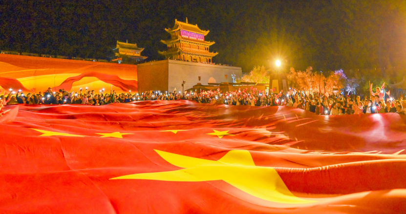 游客自发举起现场准备的巨幅国旗,同唱《我...